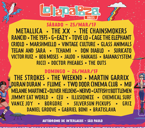 Já estão à venda os ingressos diários do Lollapalooza Brasil 2017. A inteira custa R$ 540 e a meia, R$ 270. O Lolla Pass, válido para os dois dias, custa R$ 920 (inteira) e R$ 460 (meia). Junto com a liberação das vendas, a produção também divulgou o lineup dividido por dia. Veja abaixo: