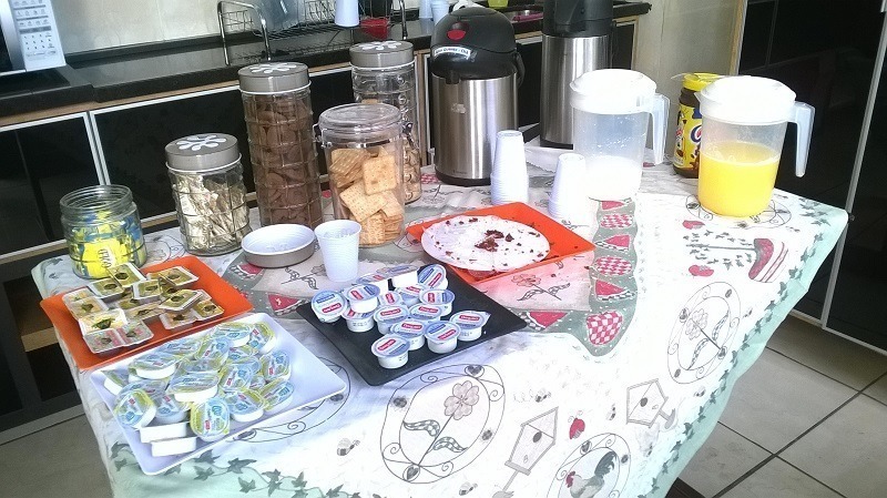 A cozinha onde o café é servido é equipada com fogão, micro-ondas, sanduicheira e geladeira. Seria legal se houvesse separação do lixo reciclável. Talheres, copos e pratos usados no café da manhã são recicláveis, fora as embalagens de manteiga, geleia e cream cheese. Me incomodou muito ver que diariamente eu estava produzindo tanto lixo que não seria reaproveitado.