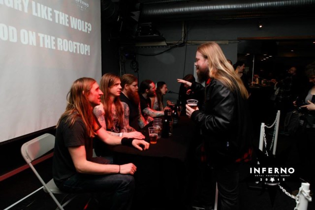 Meet & greet pode acontecer num local especial, reservado para os fãs e artistas, ou então acontecer naturalmente, de forma bem espontânea e não planejada, como aconteceu direto e reto no Inferno Festival na Noruega, em que os artistas ficaram no meio do público. Houve o lugar institucionalizado e bonitinho, ao lado dos palcos do Rockefeller, mas também não foi difícil esbarrar para lá e para cá com algumas figurinhas – Abbath ( Immortal) tava dando sopa, daí pedi a ele para assinar uns patches. Nergal (Behemoth) também tava tranquilo na quarta entre a plateia do Pokalen. Samoth (Emperor) também tava de boa no bar do Inferno… Outro festival em que isso aconteceu mais ou menos da mesma forma foi o Aalborg Metal Festival, na Dinamarca. Muitos artistas entre o público.