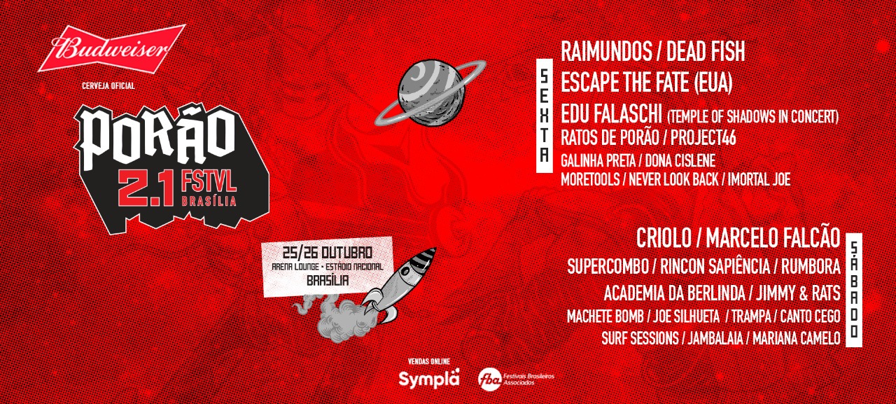 O Porão do Rock (DF) chega a sua 21ª edição com shows que agitam Brasília entre os dias 25 e 26 de outubro. O festival acontecerá no espaço Arena Lounge, no Estádio Nacional Mané Garrincha e contará com 24 atrações. O Porão 2019 aconteceria em agosto, mas por questões diversas remanejou as datas para outubro. Mesmo assim, os nomes confirmados para a data anterior seguem presentes para a realização na data atual. Farão shows nesta edição Raimundos, Escape the Fate, Criolo, Dead Fish e mais: