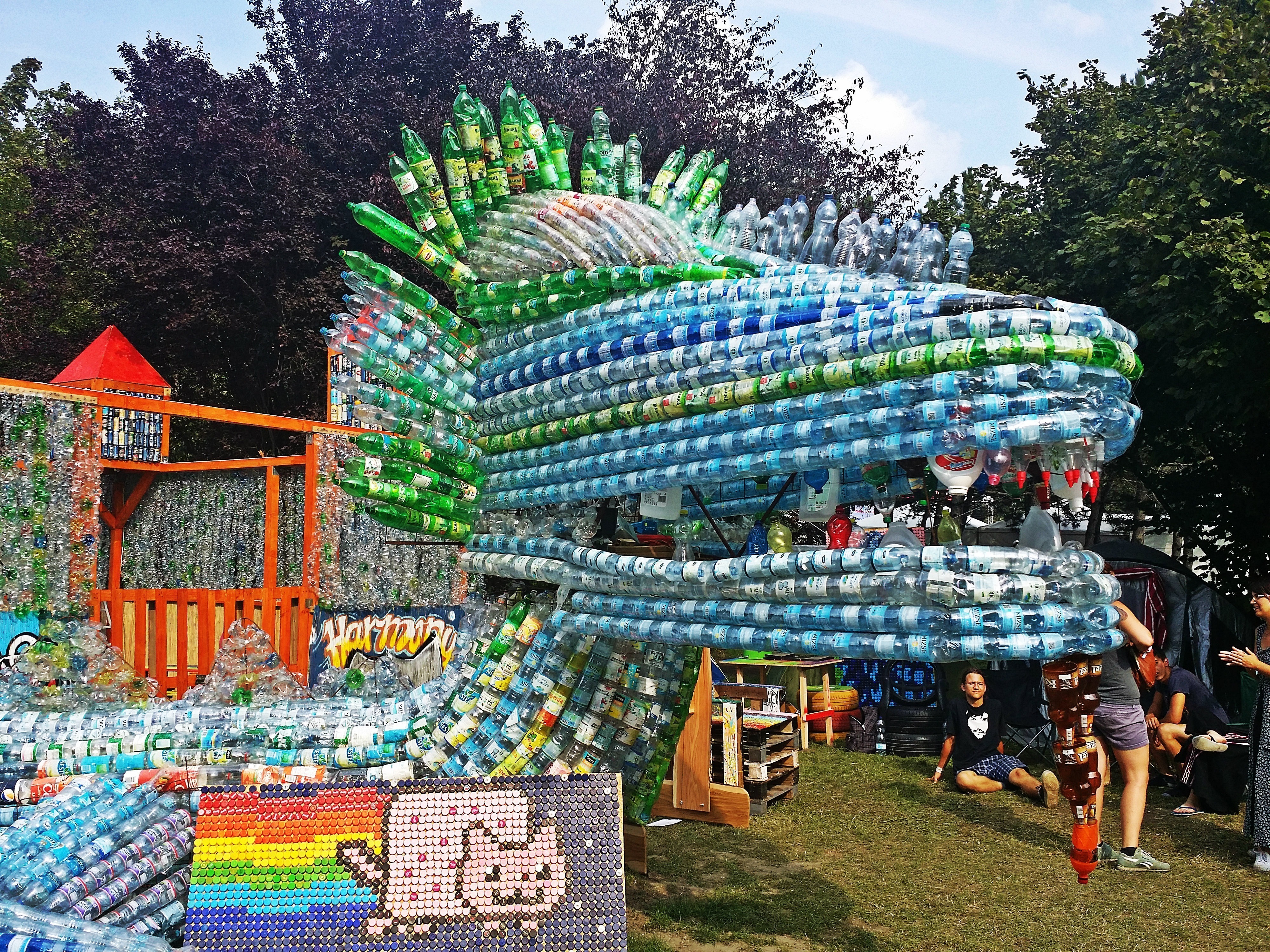 Tá certo que no Sziget a gente começou a achar toda essa quantidade meio esquizofrênica e desesperada. Não tinha uma unidade e propostas claras como eram as coisas do Roskilde, todas ligadas a um conceito. Por exemplo, o Sziget chegou a ter uma mesa de sinuca gigante ao lado de um espaço para meditação, que por sua vez, era encontrado entre as barraquinhas da área de alimentação – de onde também despontava um palco aleatório para DJs e bandas menos conhecidas. Do nada também você sempre esbarrava numa obra de arte duvidosa, tipo esse monstro de lixo/pet aqui: