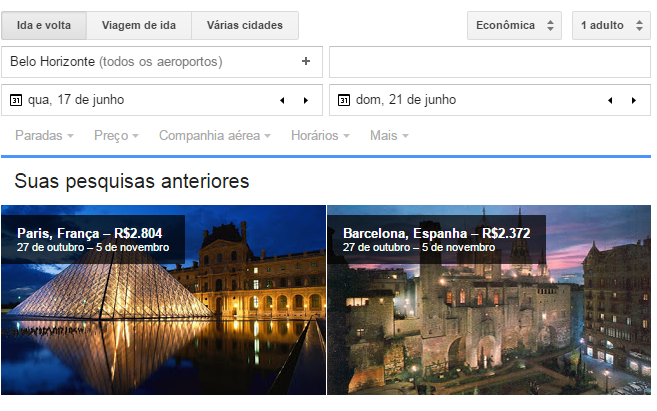 Caso você prefira deixar para comprar depois, tem a opção de salvar a sua busca e fazer o monitoramento de preços para acompanhar as oscilações das tarifas. Se você usa o Google Now, pode receber alertas. É possível também acessar pelo Chrome as buscas anteriores. Mas para isso você precisa ter feito as pesquisas logado na sua conta do Google.
