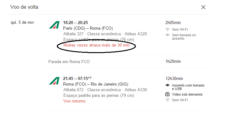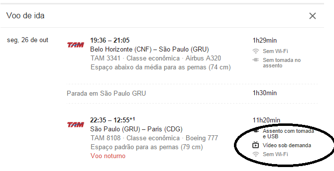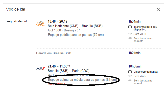 Quando você seleciona um voo, mais um recurso se revela: o Google Flights te informa sobre as condições de entretenimento a bordo, comodidade, espaço da cabine e pontualidade do voo. Quando há conexões, ele também calcula o tempo de espera no aeroporto.