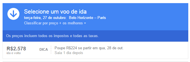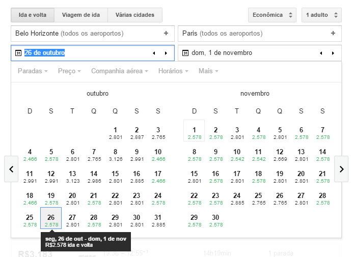 Para entender como tudo isso funciona na prática, vou mostrar aqui uma simulação que fiz numa pesquisa de voos para Paris partindo de BH no fim de outubro. (Só para alimentar ainda mais meu sonho de ir no Pitchfork Paris, que acontece este ano de 29 a 31 de outubro).