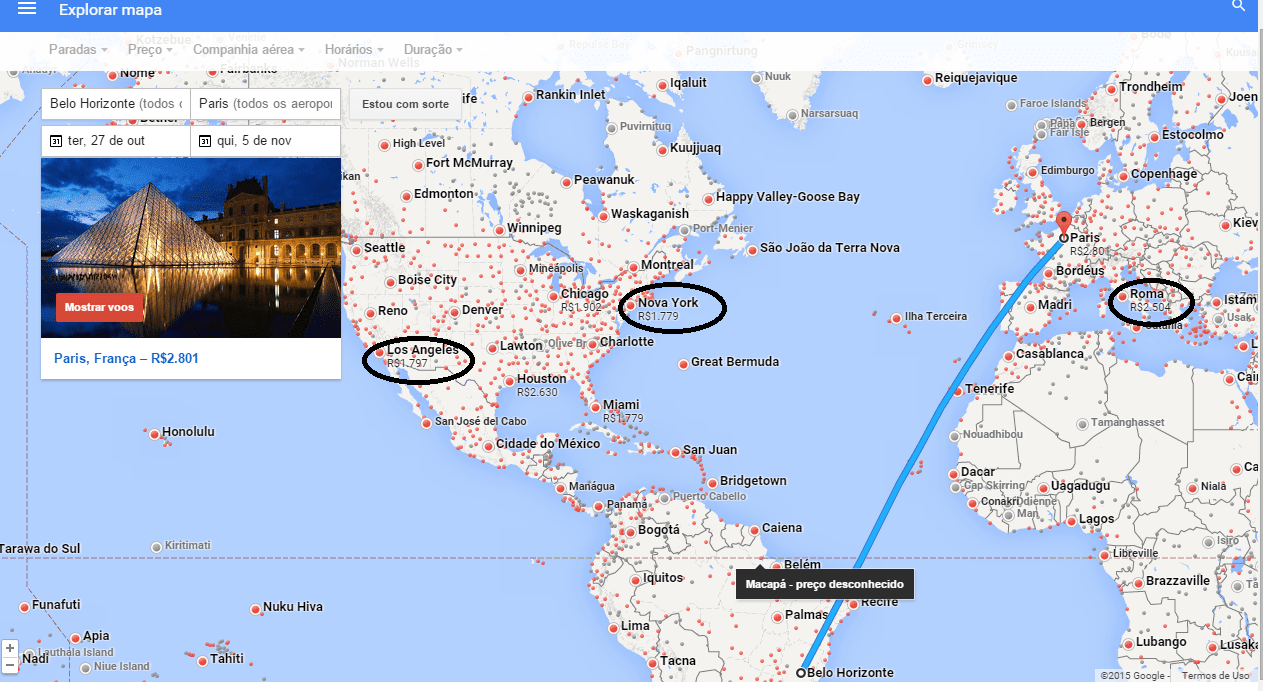 No canto superior direito da tela há um mapa que oferece ainda mais recursos. Ao expandi-lo, você visualiza os preços de passagens para outras cidades do mundo inteiro na mesma data pesquisada. Ou seja, pode acabar até mudando de ideia e indo para um destino mais barato.