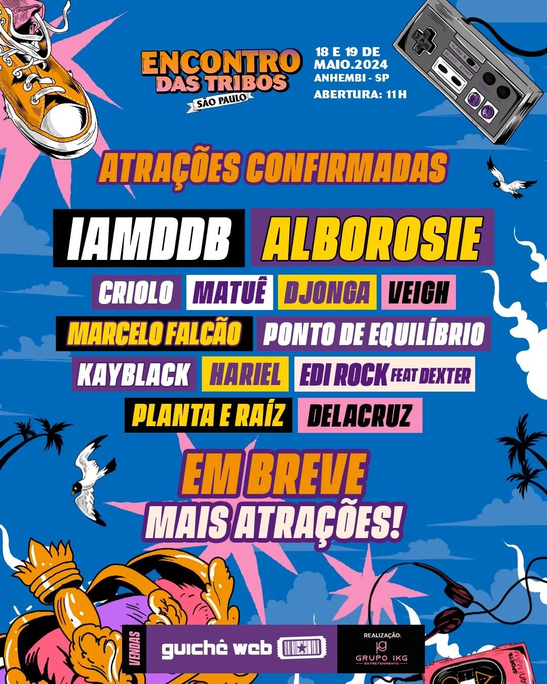 O Encontro das Tribos já tem suas primeiras atrações confirmadas: IAMDDB, Alborosie, Criolo, Matuê, Djonga e Veigh são algumas delas. Depois da divulgação da prévia do cartaz abaixo, o festival também confirmou Milky Chance entre os headliners. O festival acontece nos dias 18 e 19 de maio no Anhembi, em São Paulo. Ingressos a partir de R$ 170 aqui.