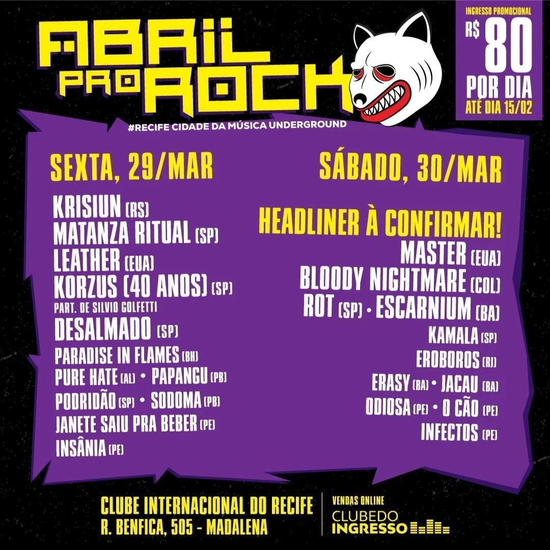O Abril Pro Rock liberou o lien up de sua edição 2023, que acontece nos dias 29 e 30 de março no Clube Internacional do Recife, no Recife. Krisiun, Matanza, Leather e Korzus são algumas das atrações confirmadas. O festival ainda vai anunciar o headliner do dia de encerramento. Ingressos à venda aqui a partir de R$ 80.
