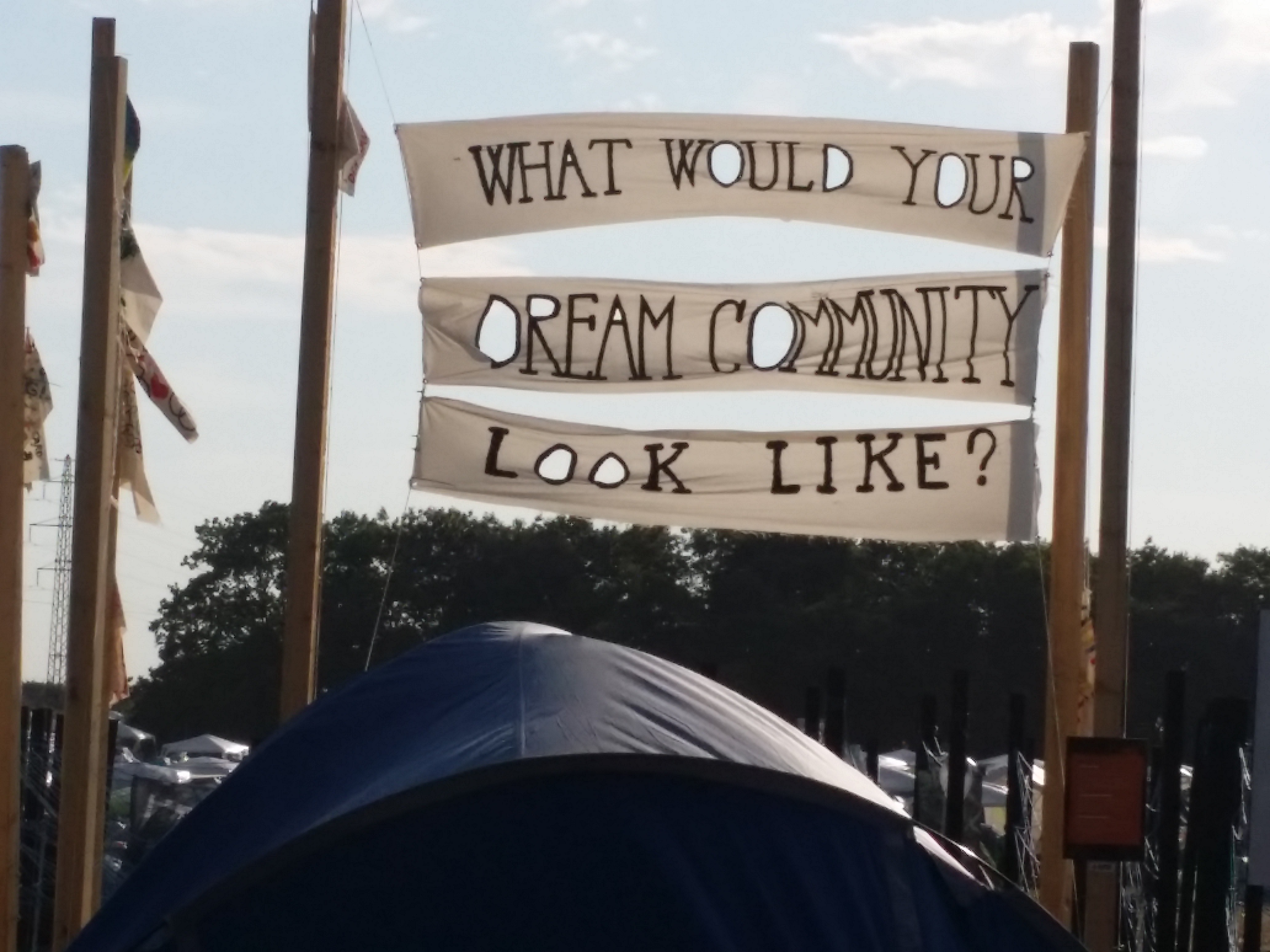 Eram mais de 30 comunidades dos sonhos, situadas na Ágora H do camping site. Certamente não conseguiríamos visitar e saber da trajetória de todas. Mesmo de longe foi possível perceber a criatividade dos habitantes sonhadores. Camp energized, o qual usava formas alternativas de obtenção de energia, como a captação solar e também a energia vinda de uma plataforma na qual os visitantes dançavam. TrashCamp, que era todo trabalhado no estilo saloon western, e propunha reciclagem de lixo – aliás, muitos camps tinham como mote a coleta e reciclagem de lixo! O que me deixou muito confusa, pois o festival continuava muito sujo, por mais que esse povo limpasse e reciclasse!