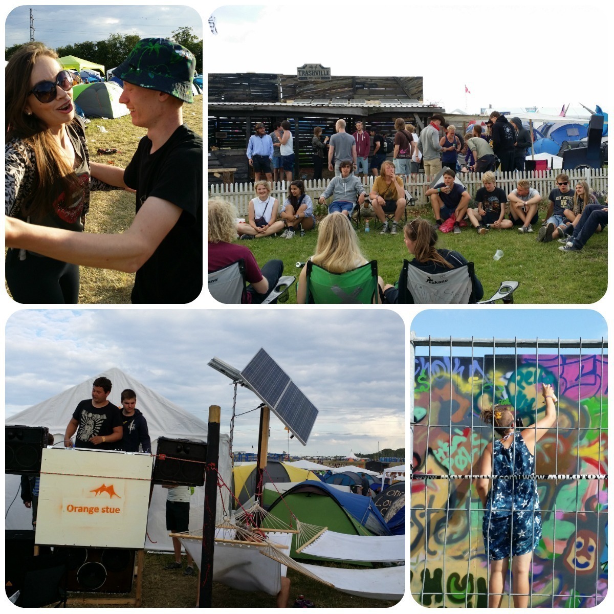 Na primeira visita que eu e Gra fizemos ao local do festival para reconhecer território, vimos que o pessoal entende que o Roskilde não se trata só de música. Por uma semana, o público vive numa cidade eternamente festeira. Como a Gra disse, é a Party City. Se não tem show ainda nos palcos, tem som alto, cerveja, gente fantasiada e pra lá de alucicrazy em cada bloco do acampamento.