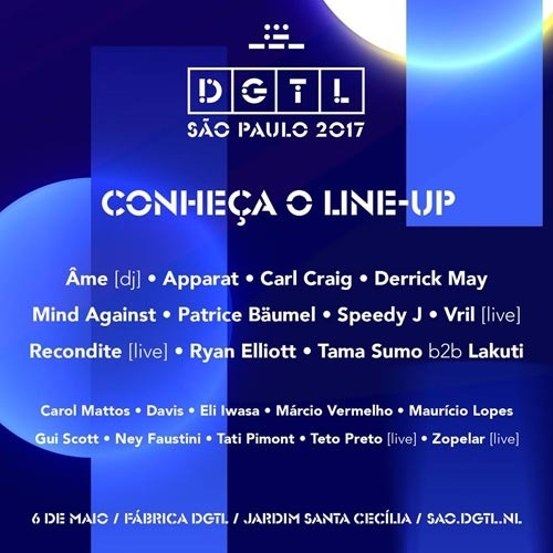 Com foco na música eletrônica de vanguarda, performances artísticas e instalações, o festival holandês DGTL terá sua primeira edição brasileira no dia 6 de maio, sábado, em Barueri, na Grande São Paulo. Ingressos a R$ 240 (inteira) e R$ 120 (meia). Confira o lineup: