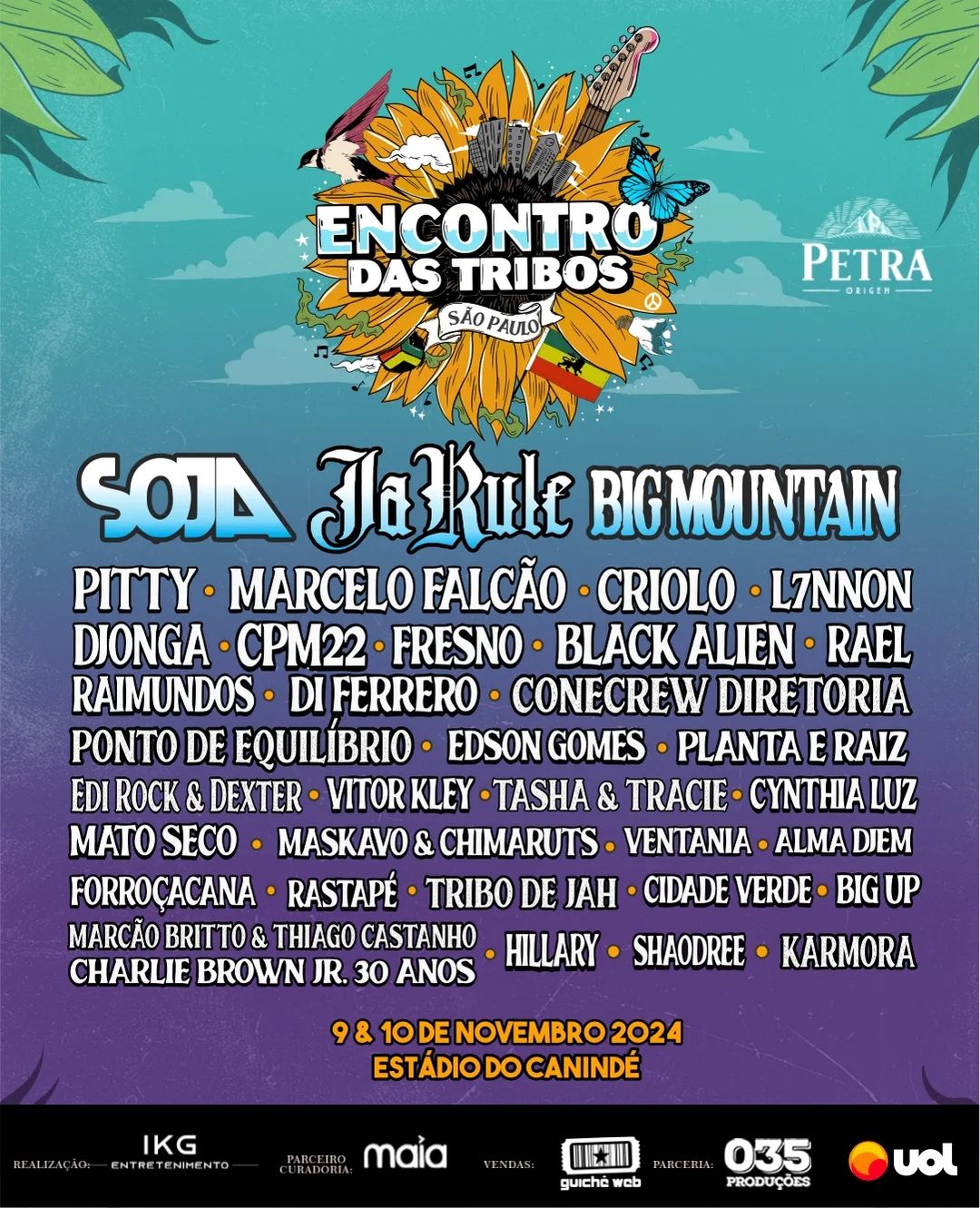 Após o adiamento de sua edição 2024 de maio para novembro, o Encontro das Tribos já tem um novo line up, que será encabeçado por Soja, Ja Rule e Big Mountain. O festival será nos dias 9 e 10 de novembro, no Estádio Canindé, em São Paulo. Ingressos à venda aqui a partir de R$ 200. Os ingressos adquiridos para as datas de maio continuam válidos.