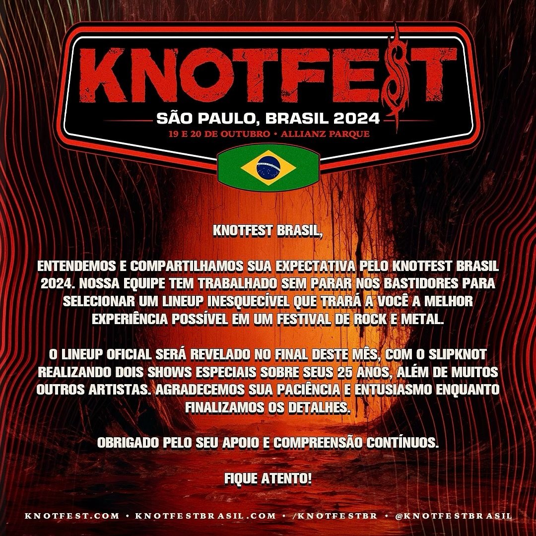 O Knotfest Brasil informou que vai divulgar o line up da edição 2024 no fim de junho. A informação veio em um comunicado oficial, diante da ansiedade dos fãs provocada pela demora no anúncio das atrações. Veja o comunicado completo abaixo.