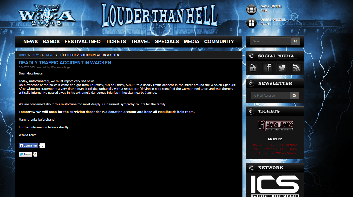 Segundo, quem guiava o carro era um amigo que também dirigia o veículo no qual vivenciei meu primeiro acidente rodoviário, felizmente não grave. Ele deu uma amassada no carro em uma mureta, eu levei uma lambida no pescoço do cinto de segurança, mas todo mundo no carro ficou bem. O terceiro agravante foi que, ao entrarmos no carro soubemos que um metalhead havia morrido em um acidente de carro fatal, indo para o Wacken, na estrada que dava acesso ao festival.
