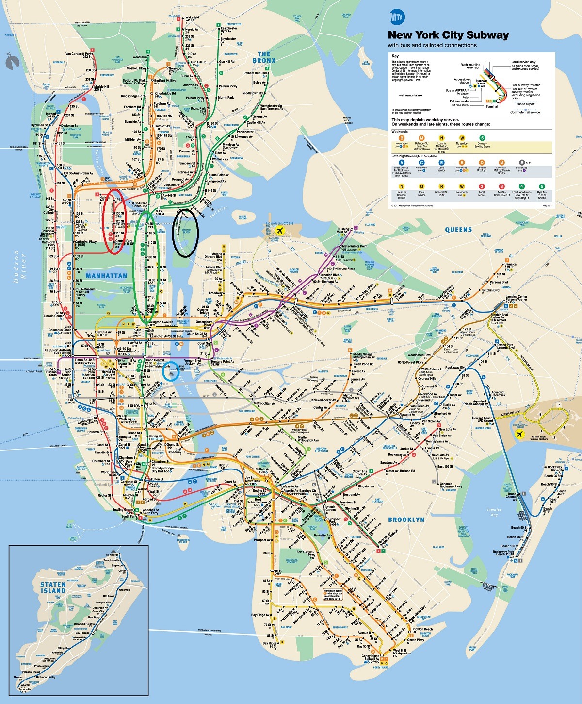 O Governors Ball acontece na Randall’s Island, uma ilhazinha entre a porção norte de Manhattan e o Queens (círculo preto no mapa abaixo). A melhor forma de chegar lá vai depender de onde você vai ficar em Nova York. Acompanhe as instruções a seguir junto com o mapa do transporte público da cidade: